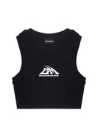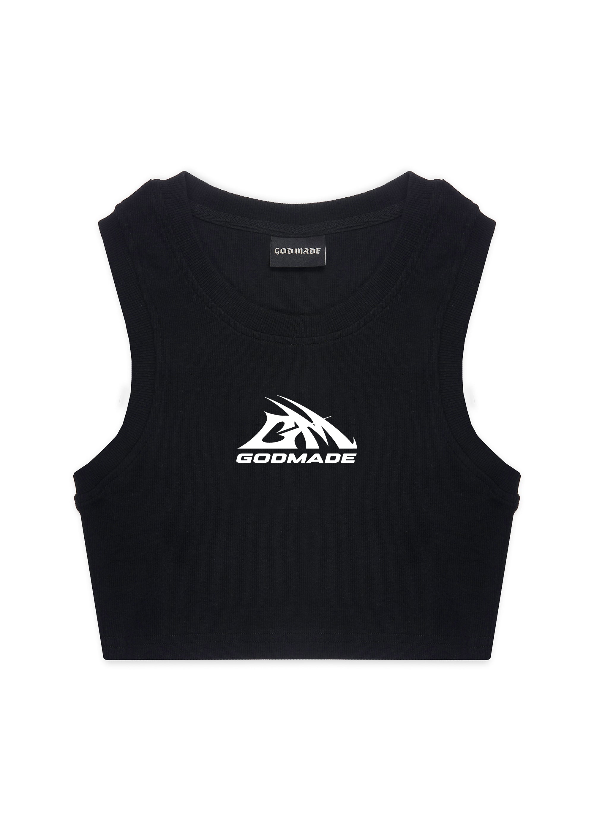GM cropped ribbed vest black in the classic vest silhouette. Crafted from a lightweight soft rib, the vest has a slightly tighter fit, with neck and armhole binding details. finished with GM logo centre chest design.