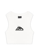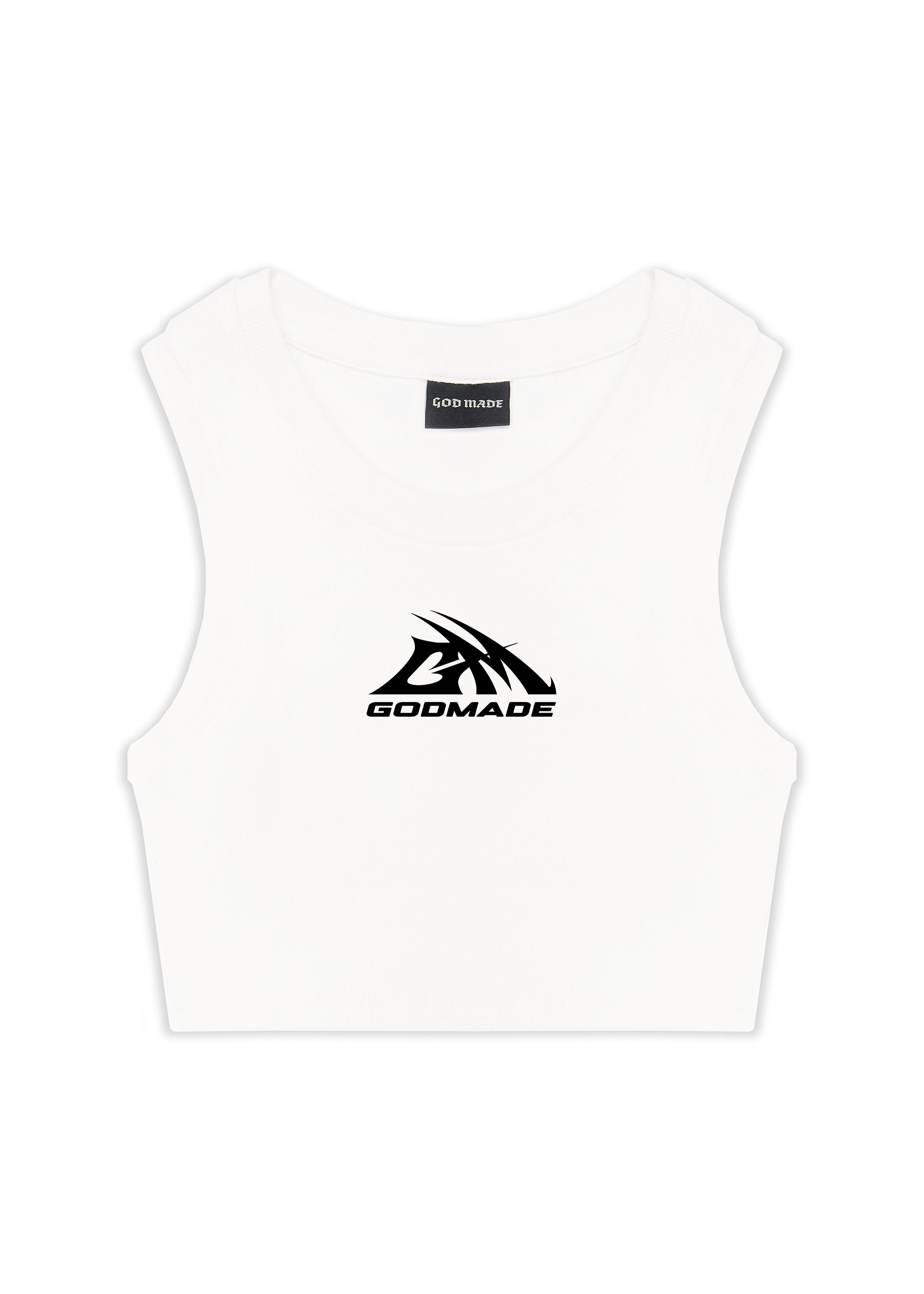 GM cropped ribbed vest white in the classic vest silhouette. Crafted from a lightweight soft rib, the vest has a slightly tighter fit, with neck and armhole binding details. finished with GM logo centre chest design.