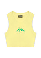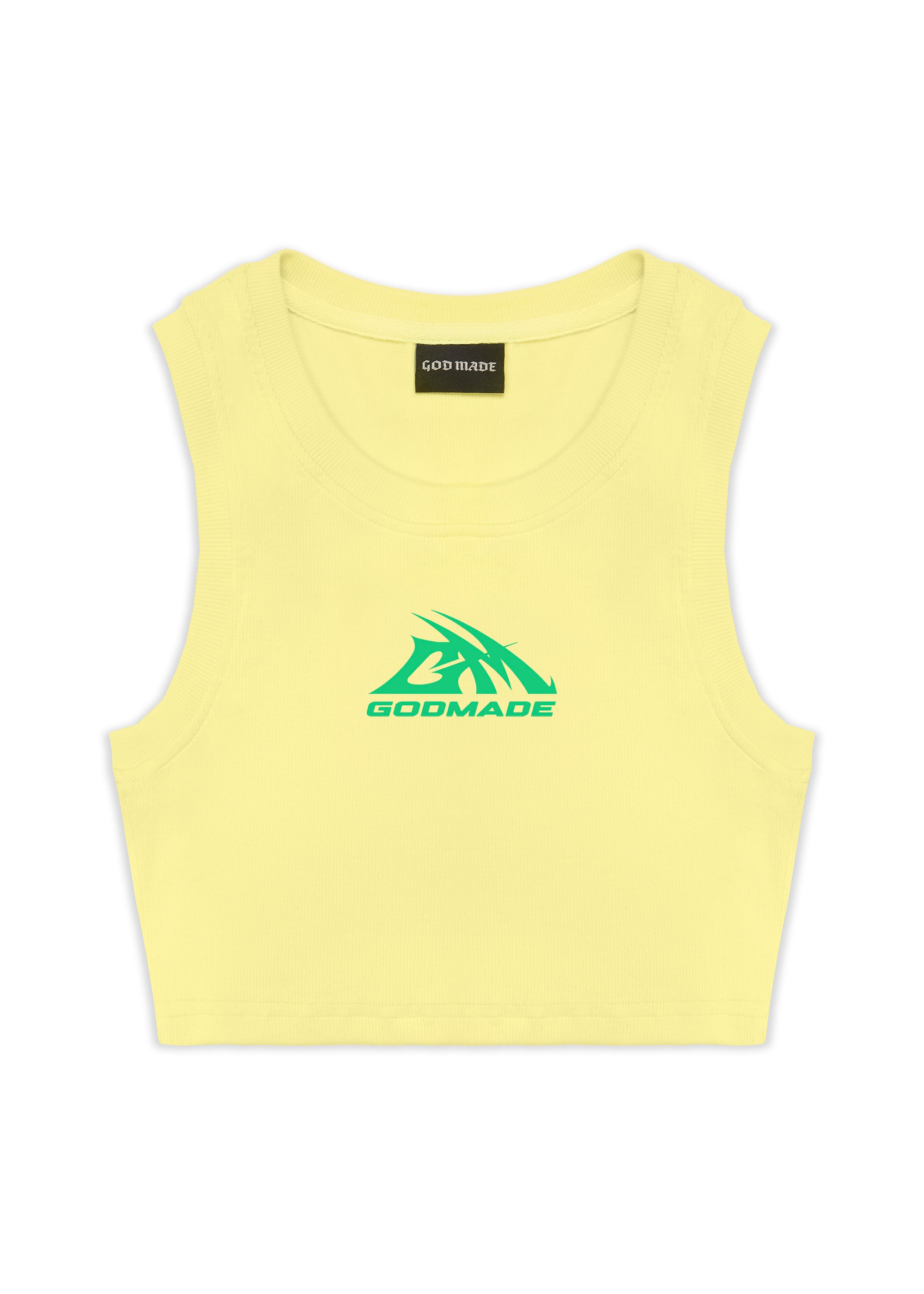 GM cropped ribbed vest yellow in the classic vest silhouette. Crafted from a lightweight soft rib, the vest has a slightly tighter fit, with neck and armhole binding details. finished with GM logo centre chest design.
