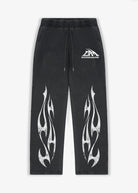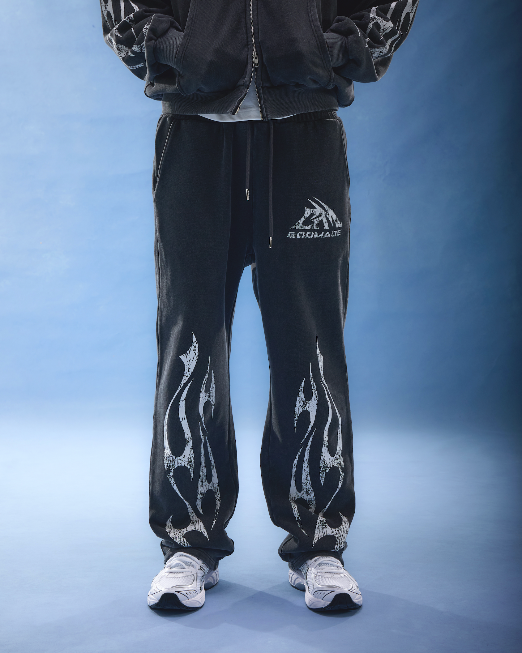 GM logo grey washed sweatpants, made from 100% cotton. Wide leg straight sweatpants crafted from 100% cotton 480gsm. Elasticated waistband with drawstring, It has two hip pockets and is finished with GM logo graphic design.