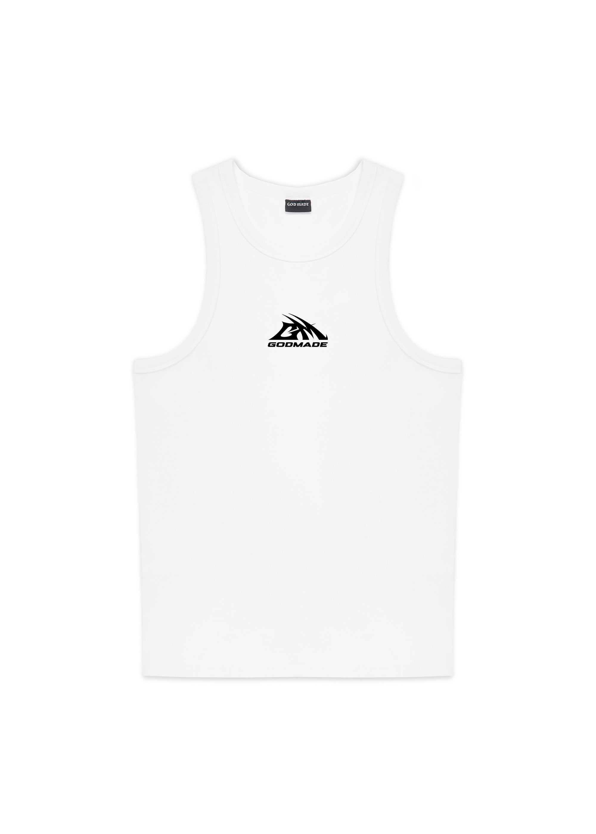GM ribbed vest white in the classic vest silhouette. Crafted from a lightweight soft rib, the vest has a slightly tighter fit, with neck and armhole binding details. finished with GM logo centre chest design.