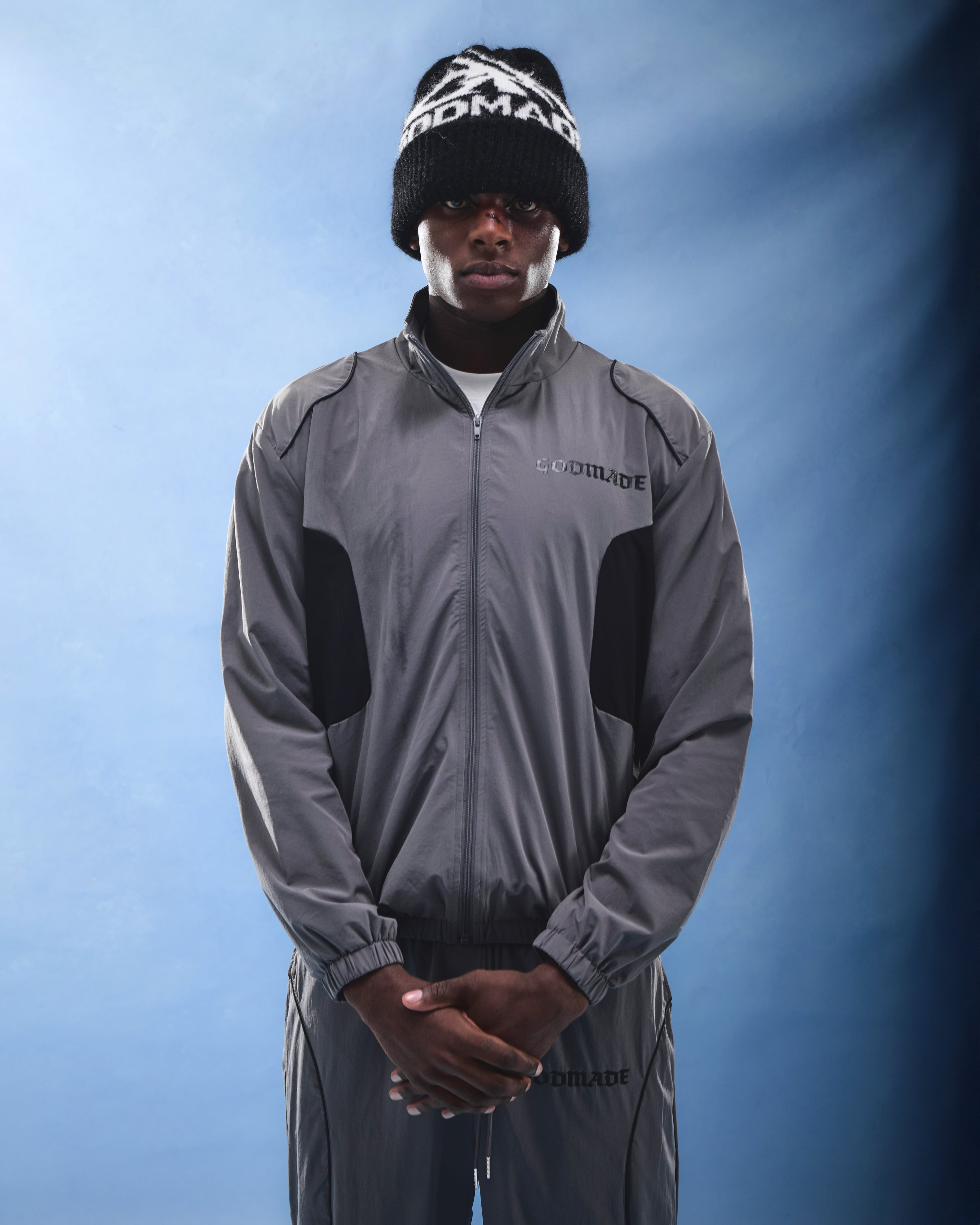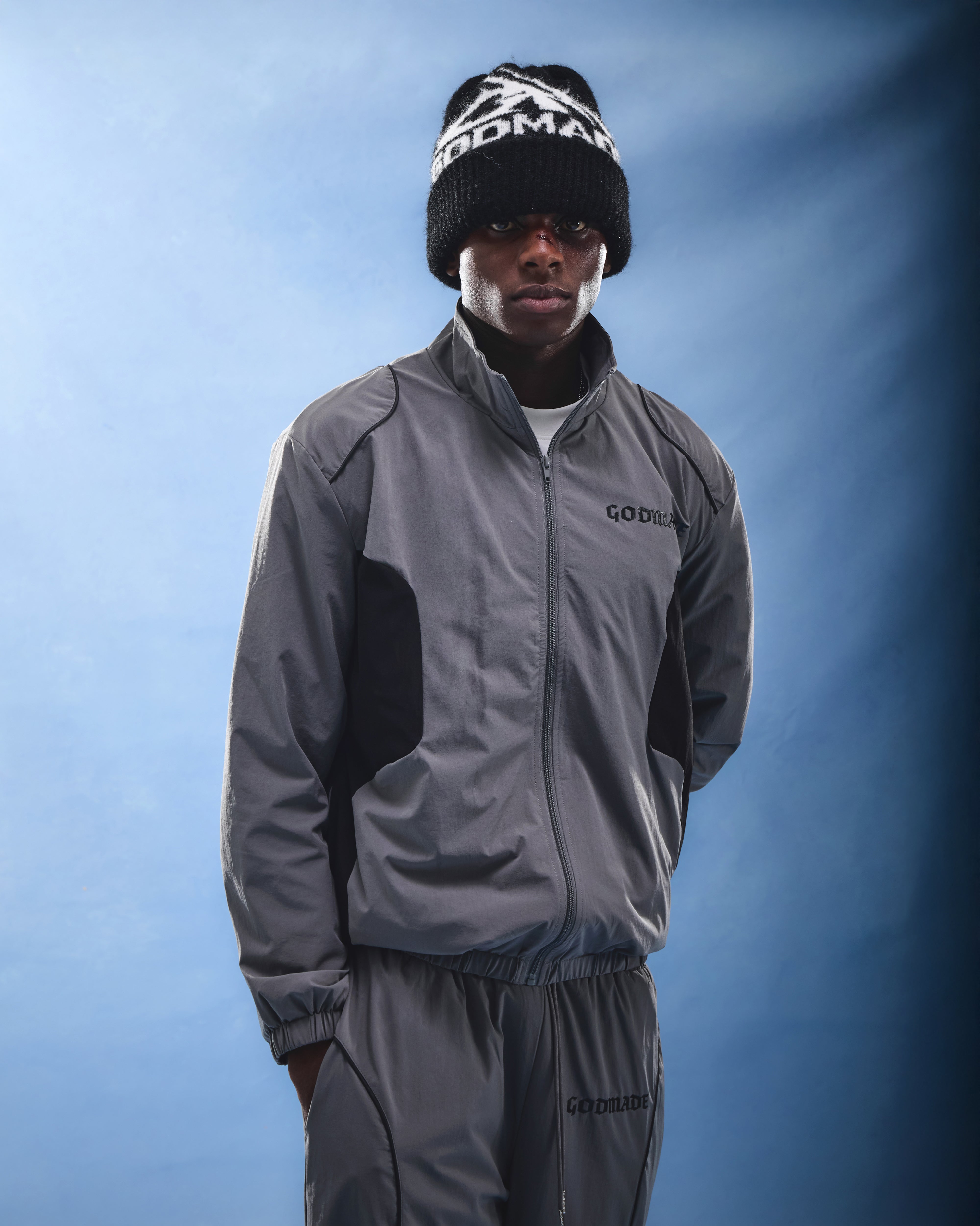 Introducing the phantom tracksuit Jacket in grey, a regular fitting track jacket with custom logo detailed zip closure, minimal thin black lining detail, elasticated hem and cuffs, and a self fabric lined. Finishing this track jacket with signature Godmade black on the chest.