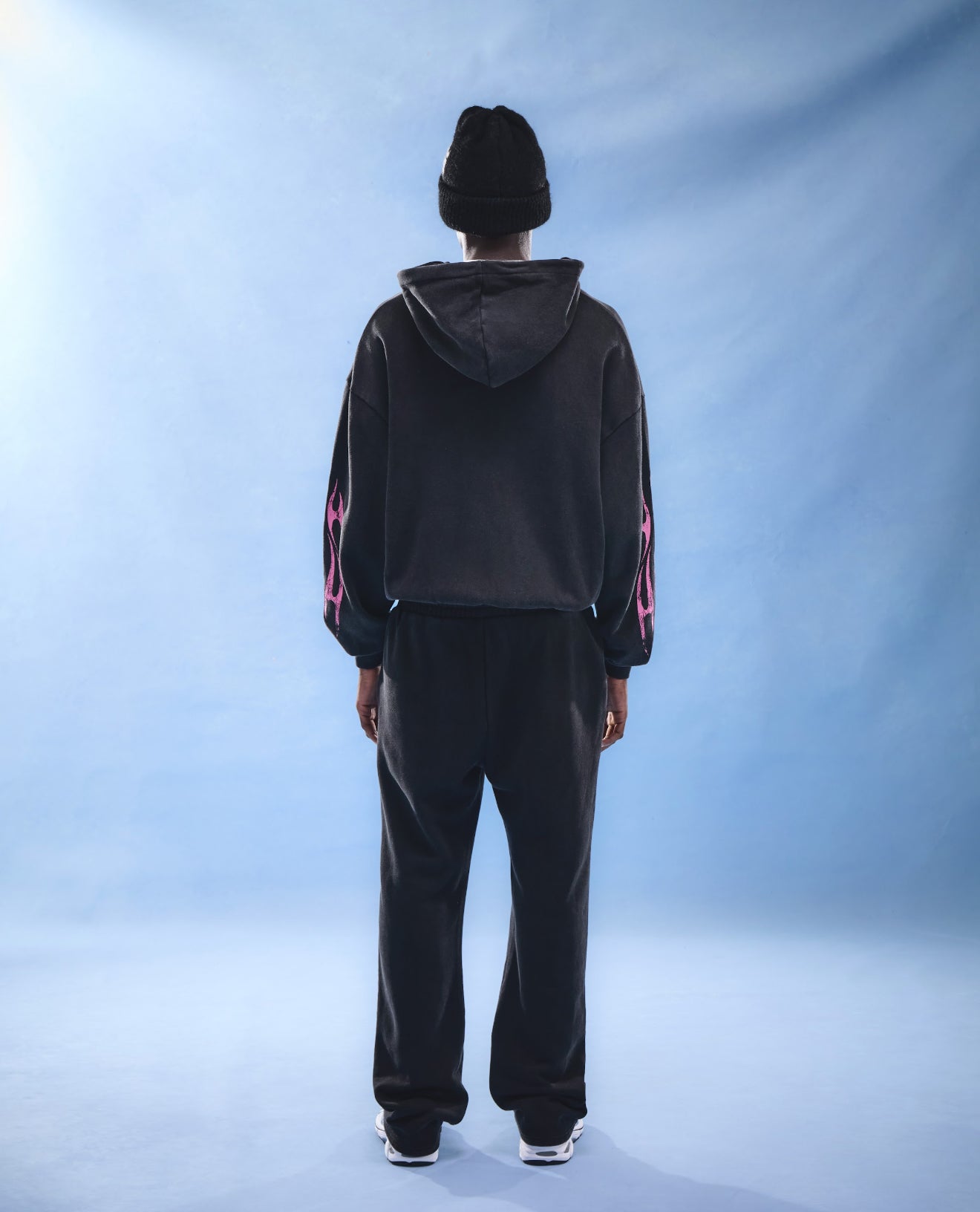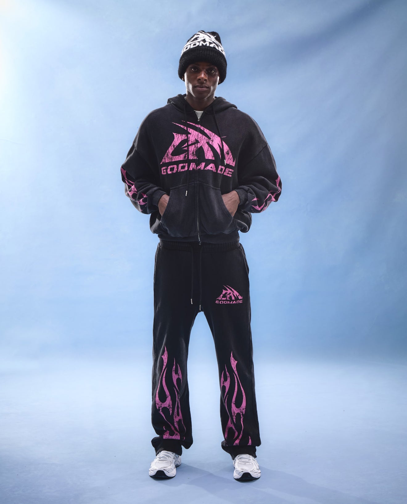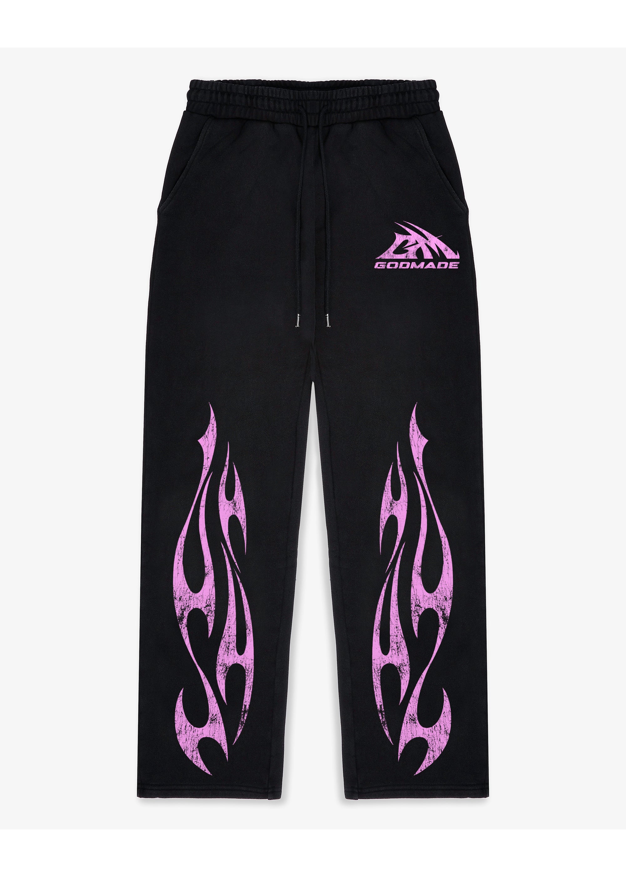 GM logo pink black sweatpants, made from 100% cotton. Wide leg straight sweatpants crafted from 100% cotton 480gsm. Elasticated waistband with drawstring, It has two hip pockets and is finished with GM graphic logo in pink and flames to match.