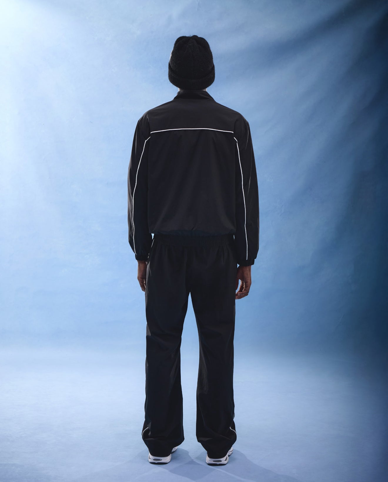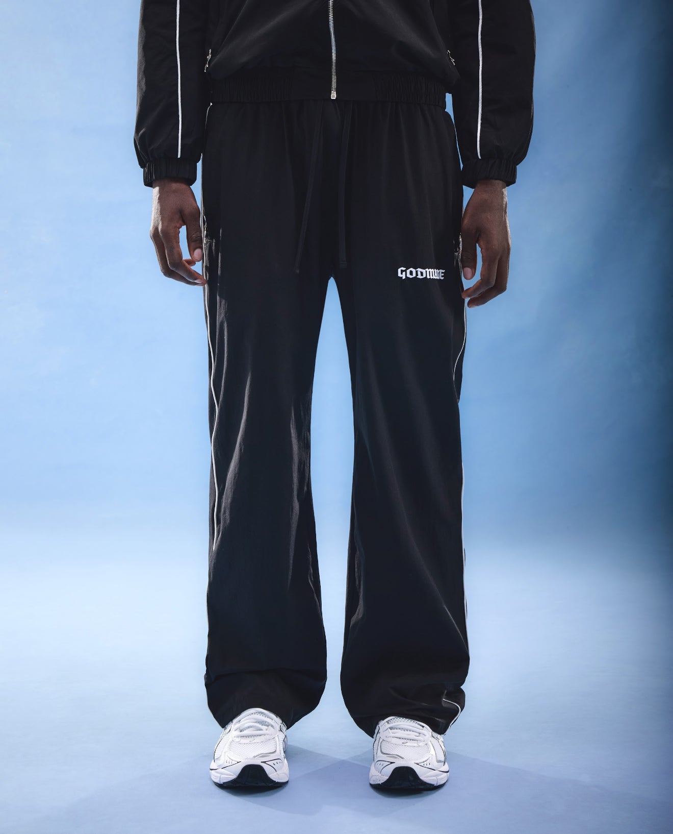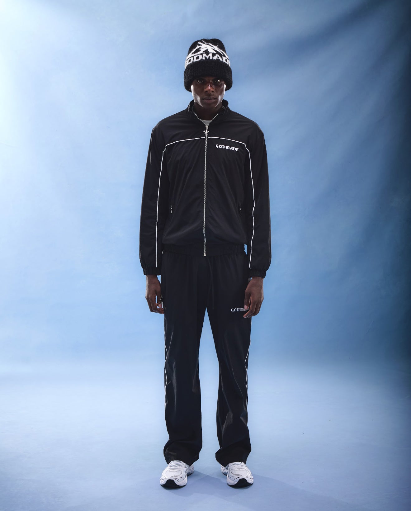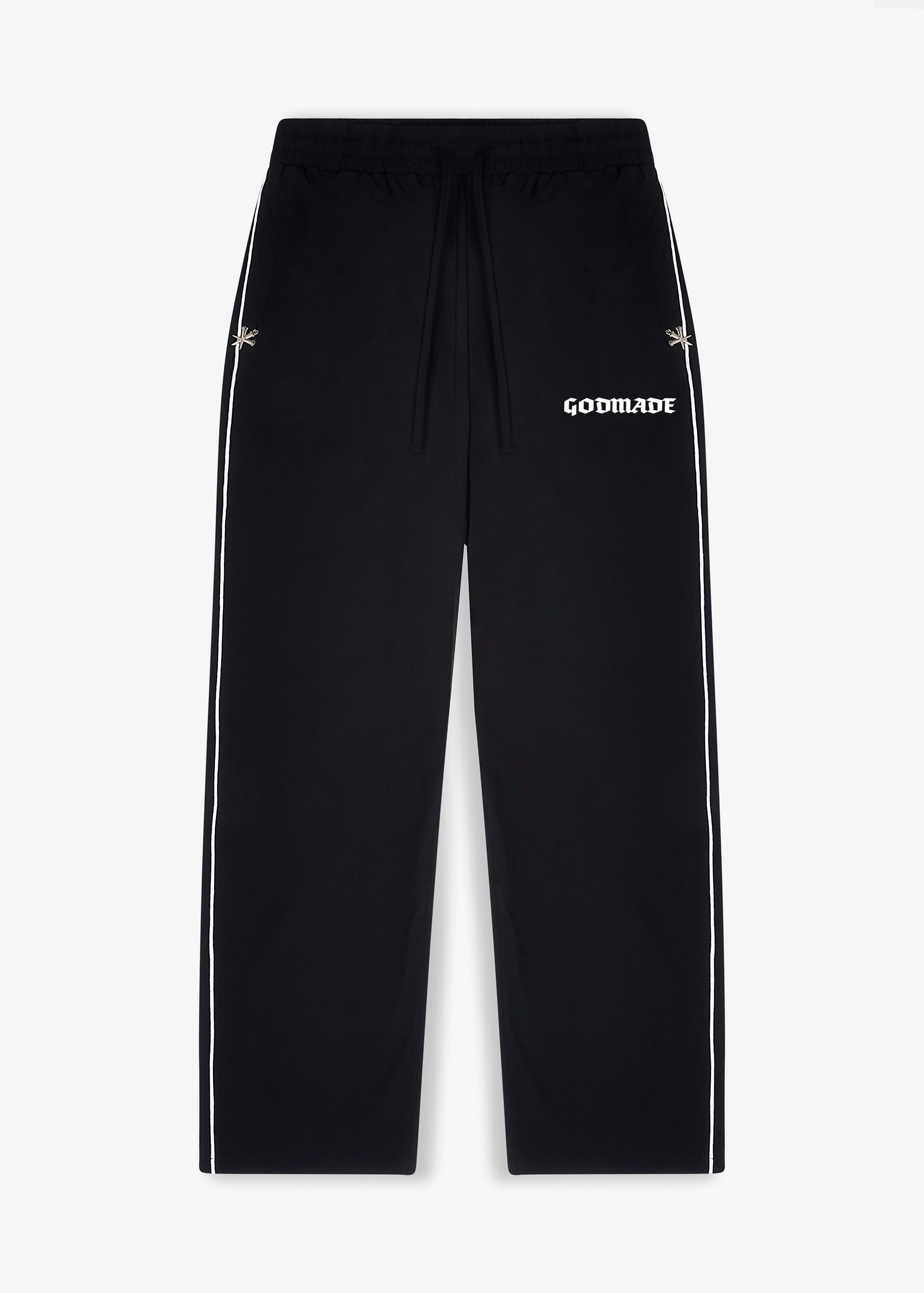 Introducing the Tracksuit Pants in Black, a relaxed fit tracksuit pant with an elasticated waist and adjustable fit. These tracksuit pants have logo detail zip pockets, minimal white line side seam detailing. Finishing this track pants with signature Godmade white stitching on the left leg.