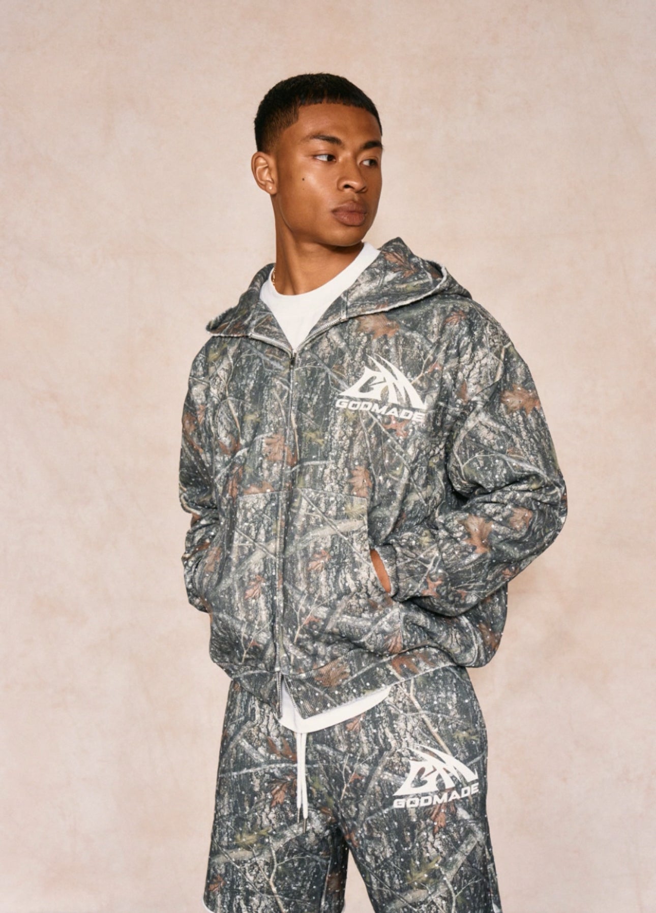 Forest camo rhinestone zip hoodie fits slightly oversized fit. featuring improved cotton to ensure quality and longevity.