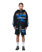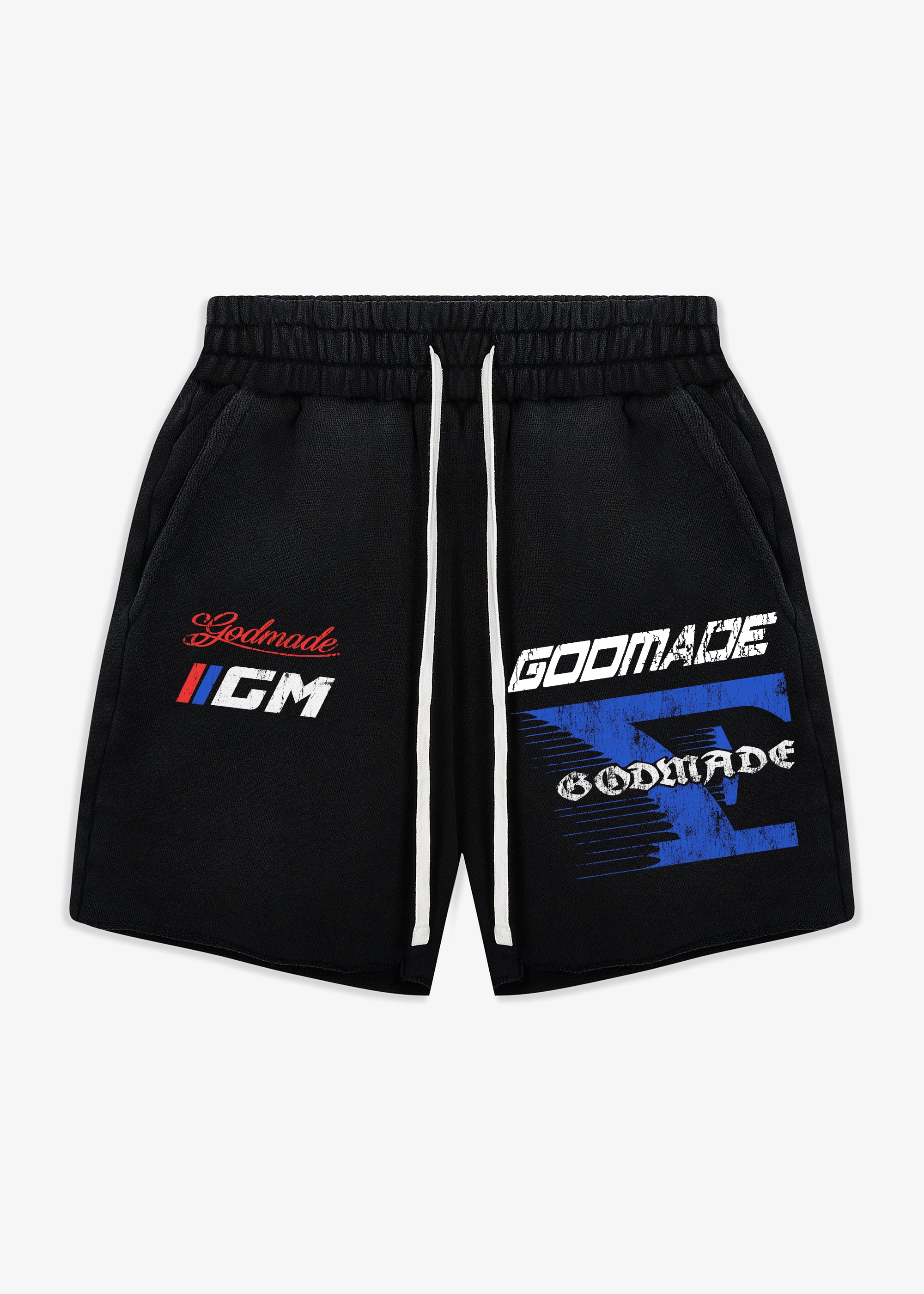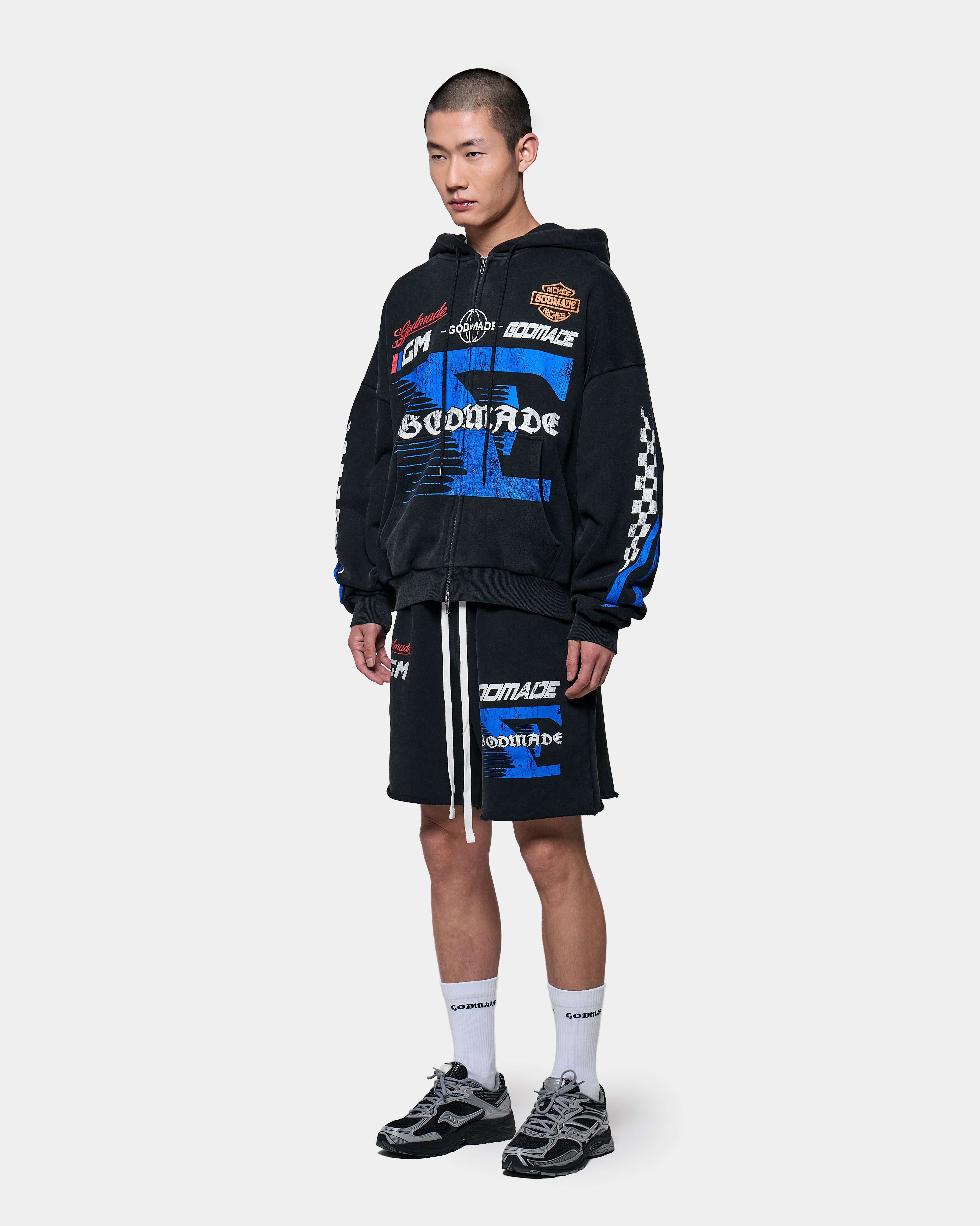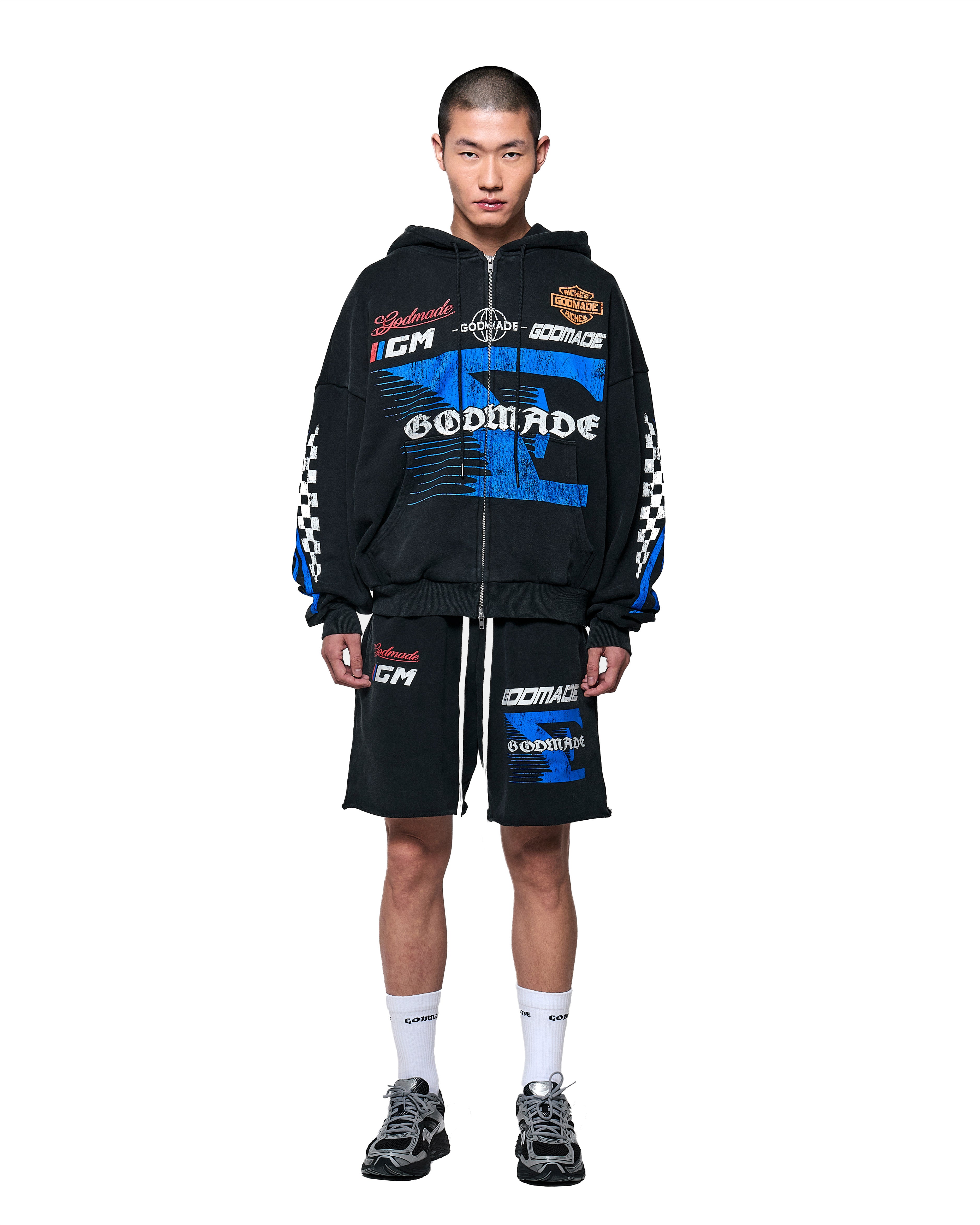 The garment features a series of racing-inspired graphics developed in-house at GODMADE. The design blends GM insignia, speed typography, and layered visual elements to create a bold composition across the piece.