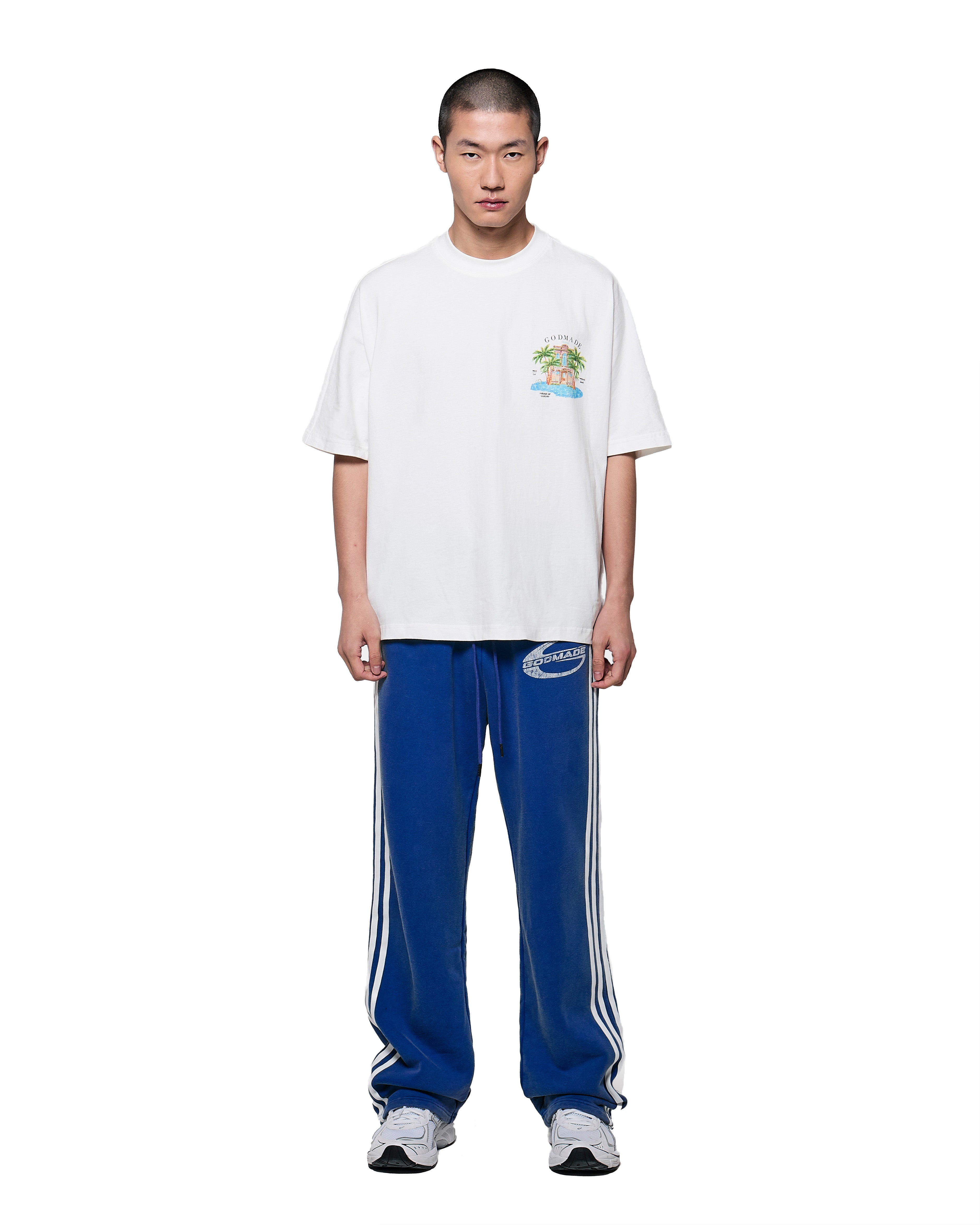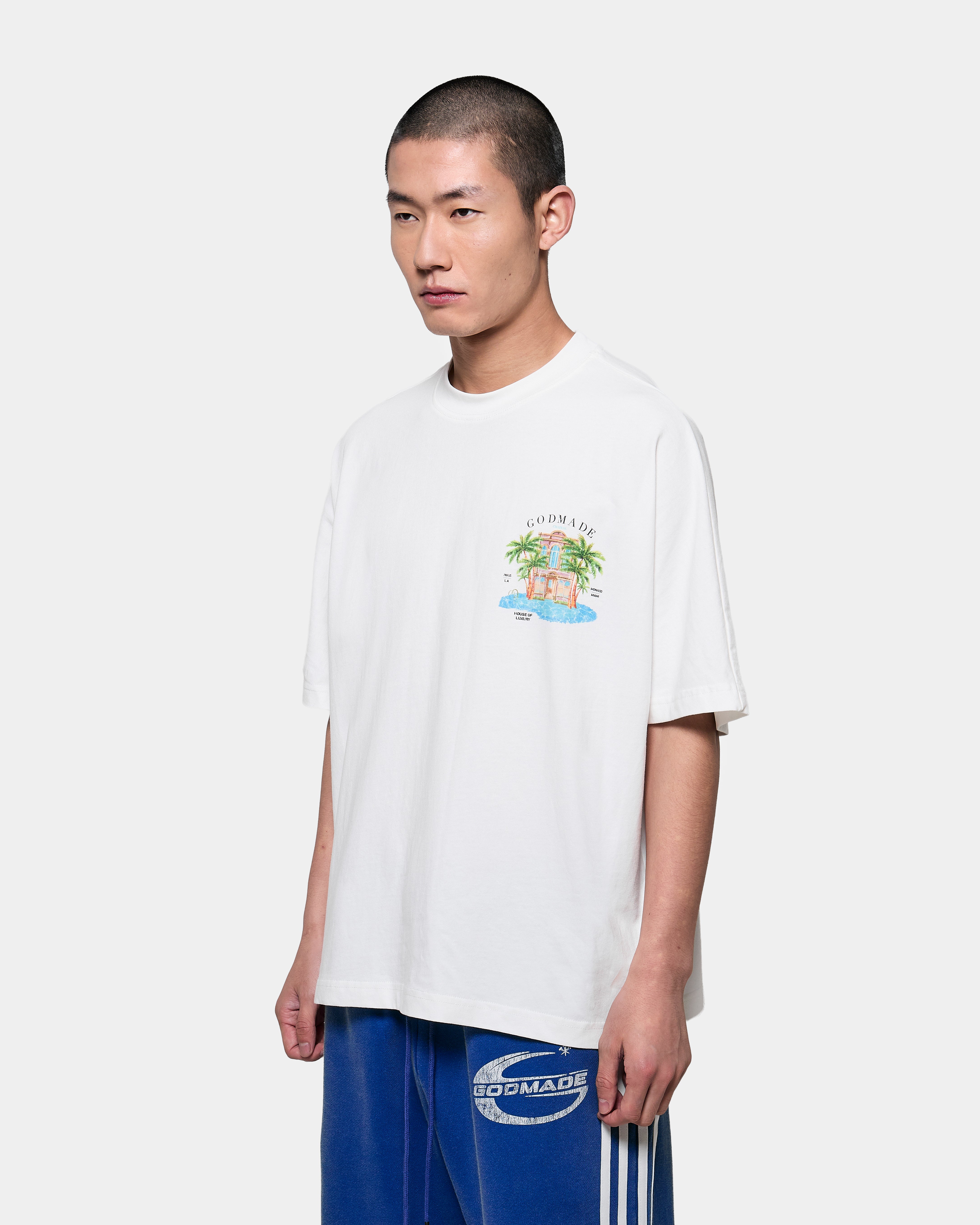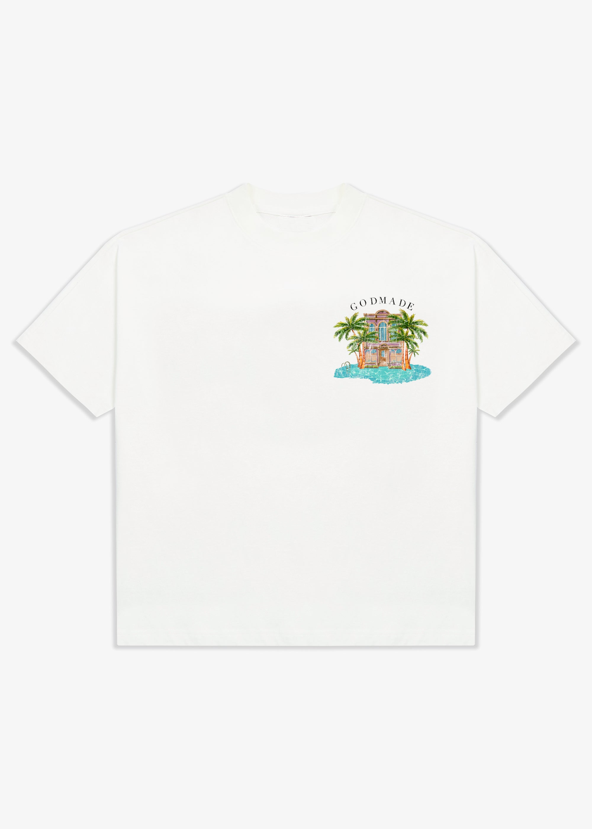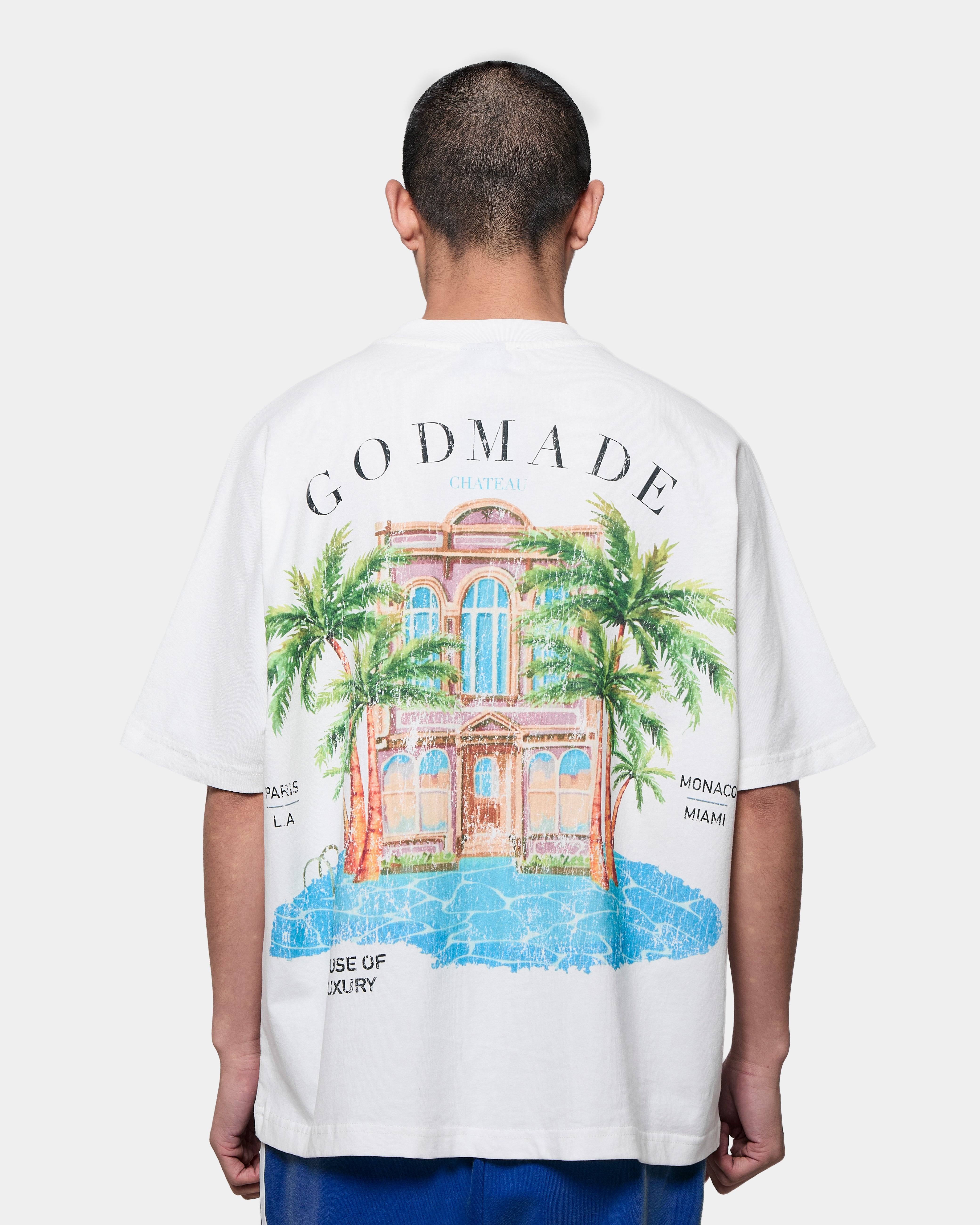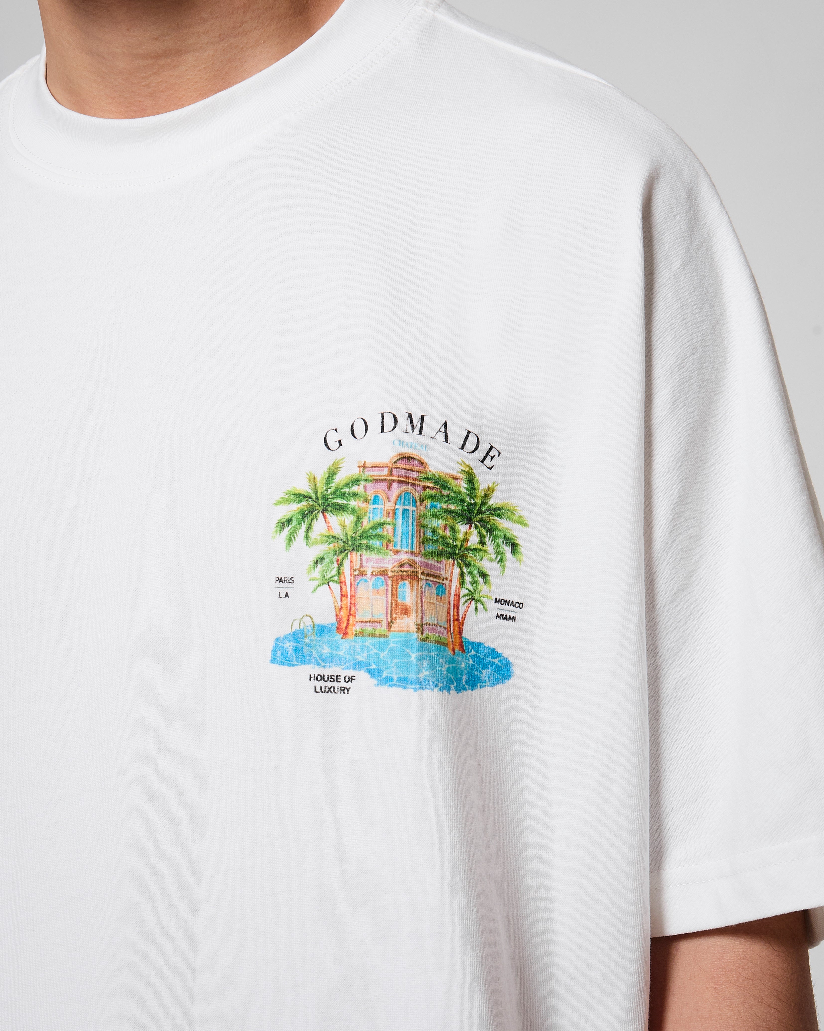The piece features original hand-drawn artwork developed in-house at GODMADECLO. A refined château graphic sits at the front, while the back expands into a full composition combining palm landscapes, architectural detailing.