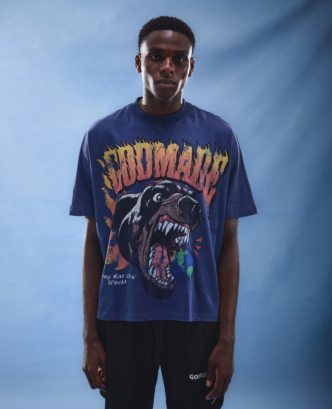 Dog world blue washed t-shirt fits slightly oversized with a relaxed, boxy fit. Made from luxury cotton featuring soft and breathable fabric ensure quality and longevity. Finishing this piece with dog world design.