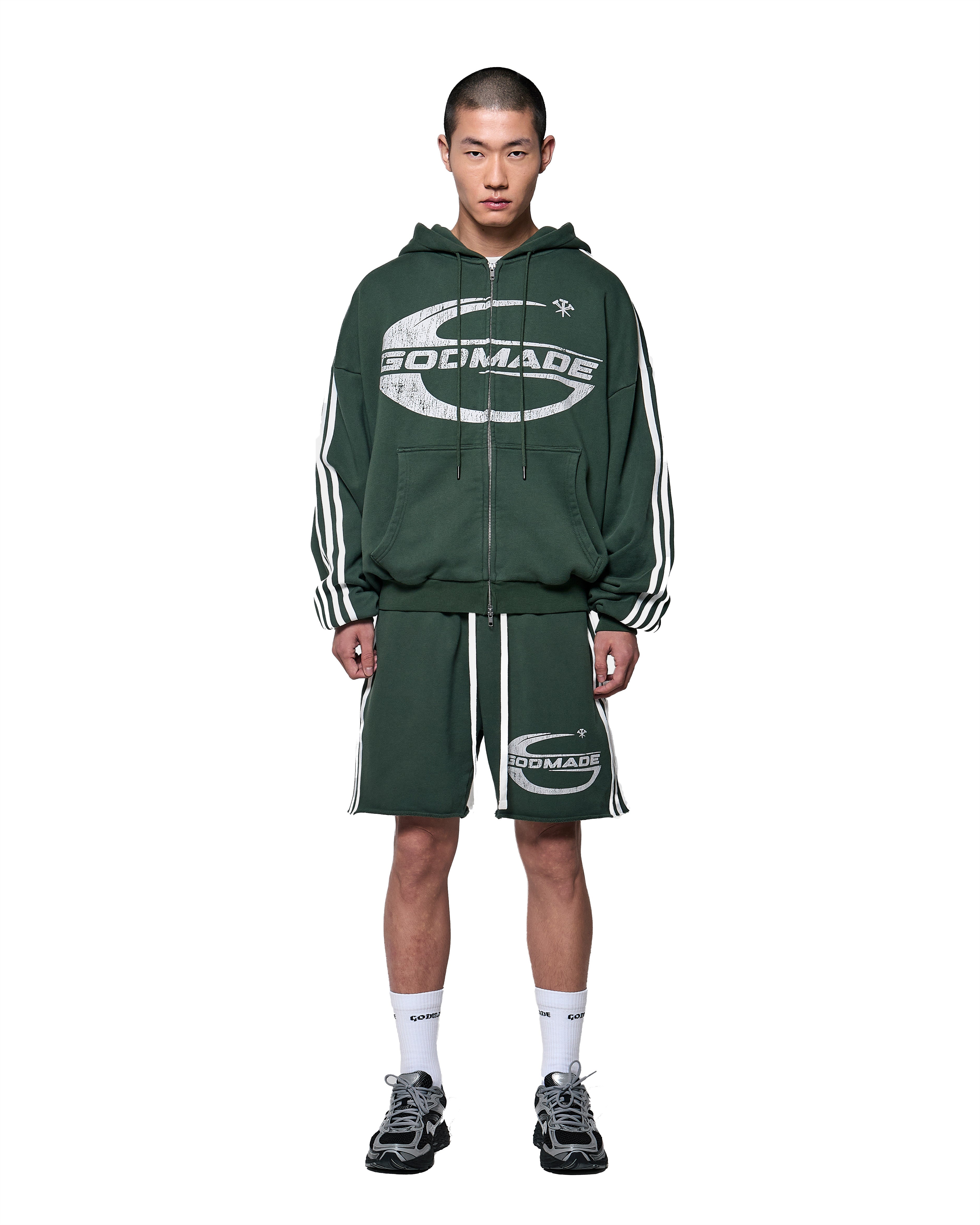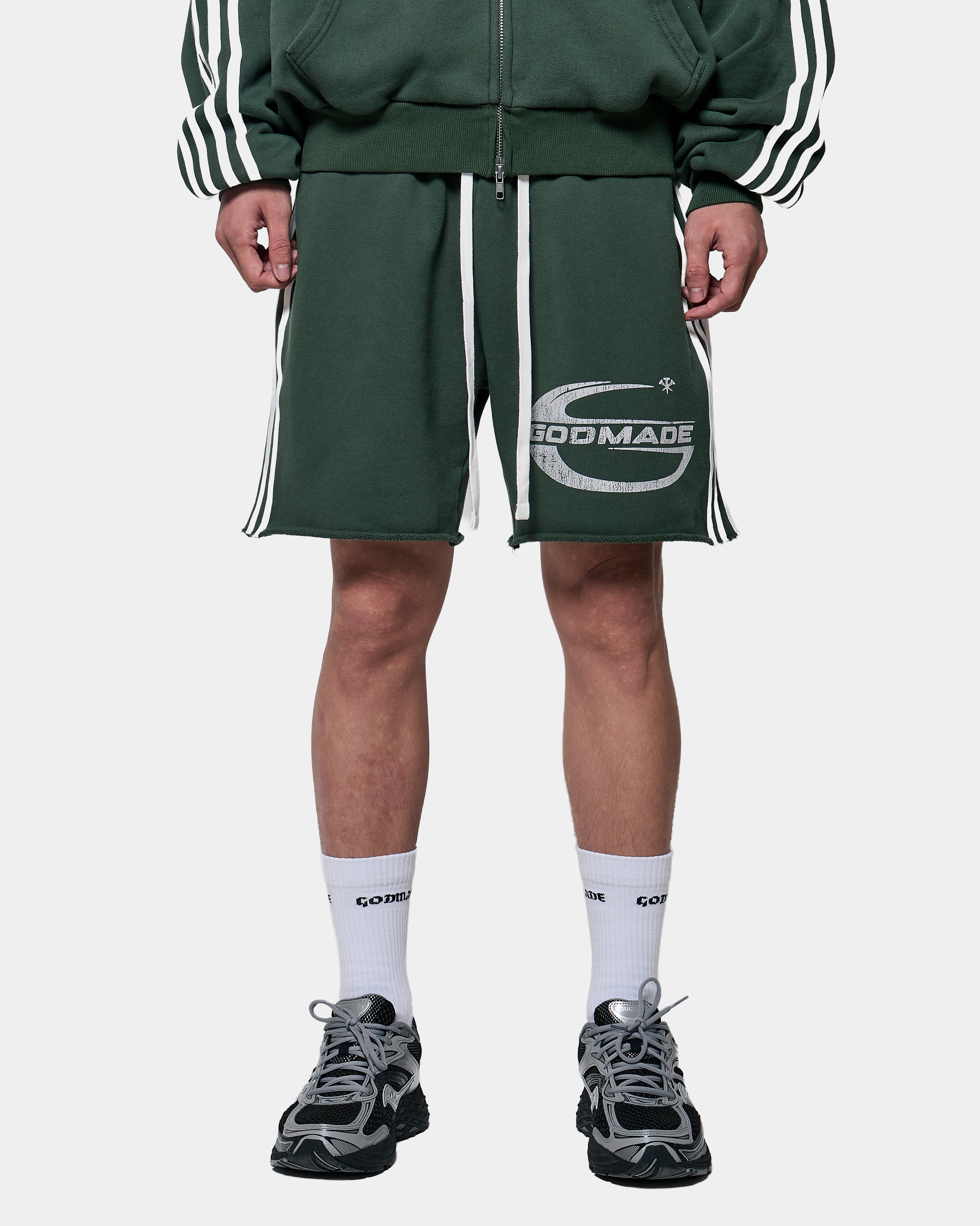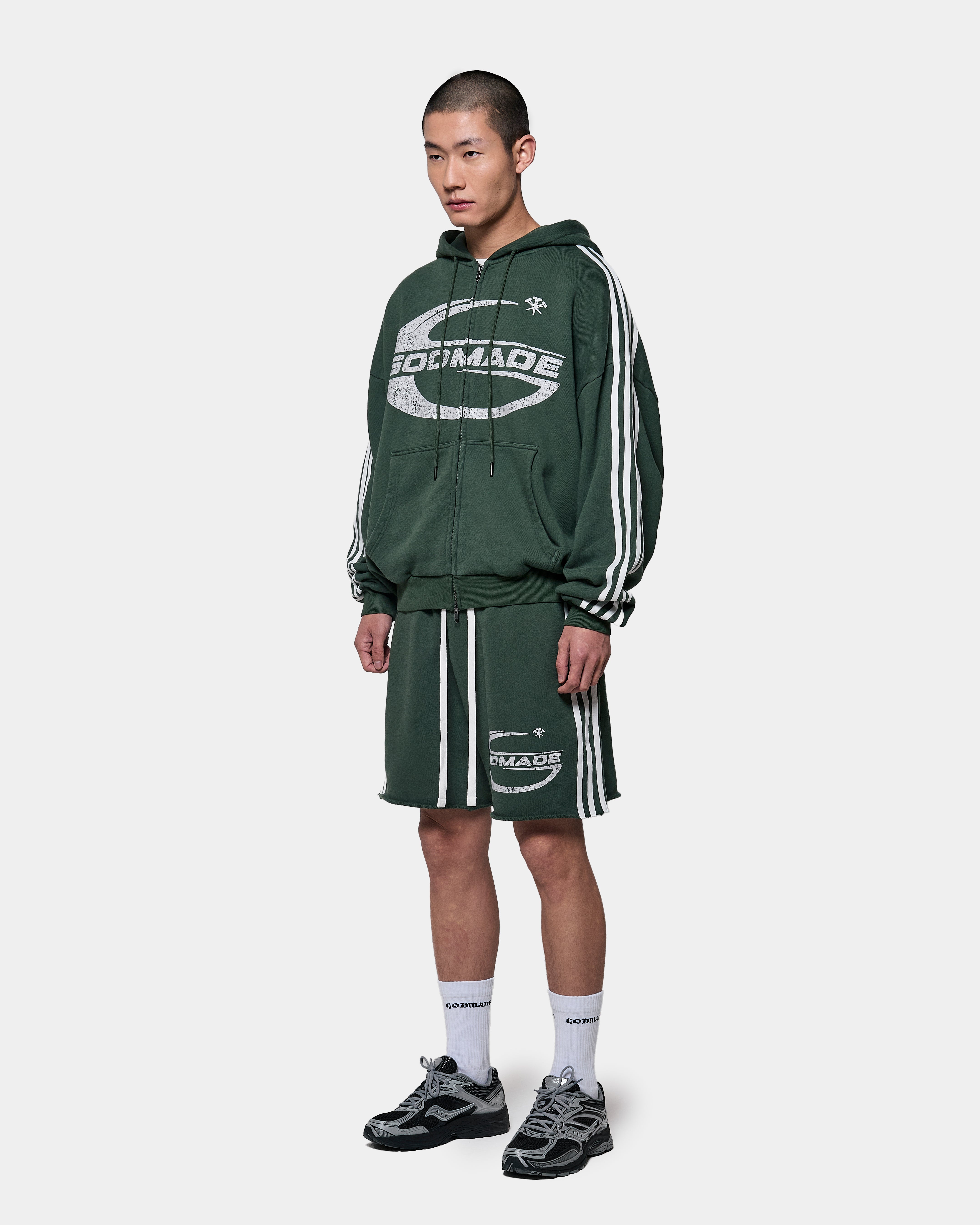 A screen printed GODMADE graphic forms part of the garment’s visual composition, reinforcing the bold identity of the piece.