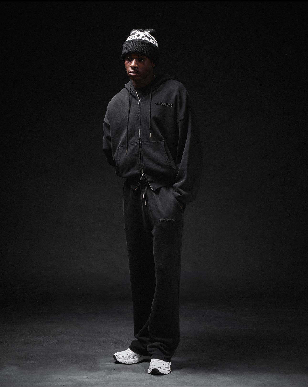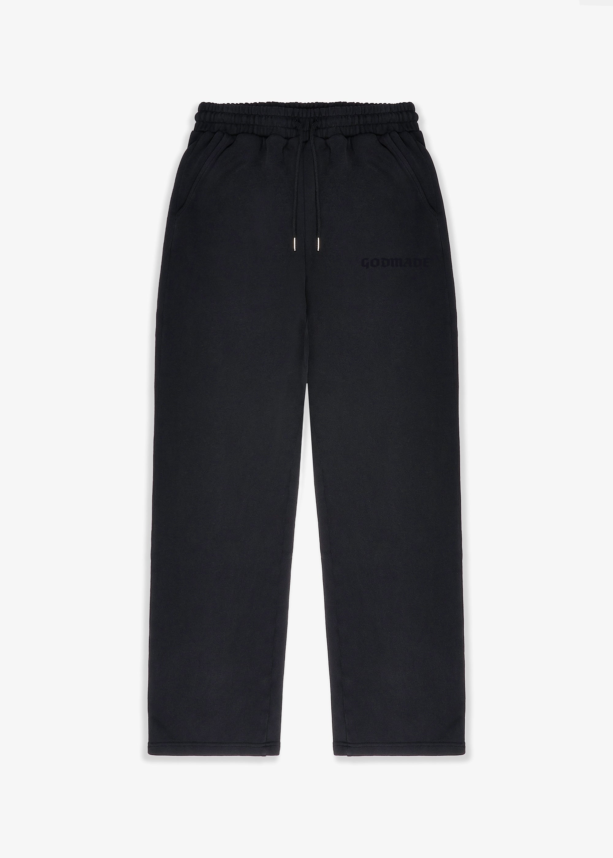 Onyx black sweatpants, made from 100% cotton. Wide leg straight sweatpants crafted from 100% cotton 480gsm. Elasticated waistband with drawstring, It has two hip pockets and is finished with tonal Godmade stitching.