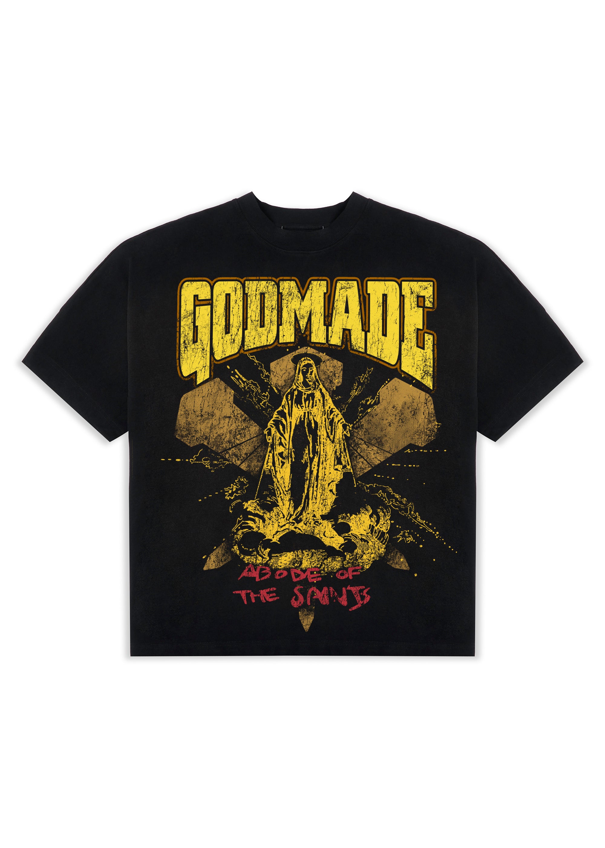 Abode of the saints black washed t-shirt fits slightly oversized boxy fit. featuring improved cotton to ensure quality and longevity.