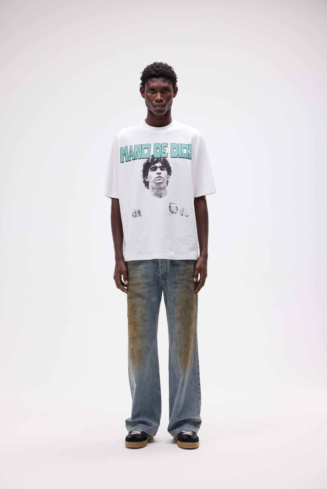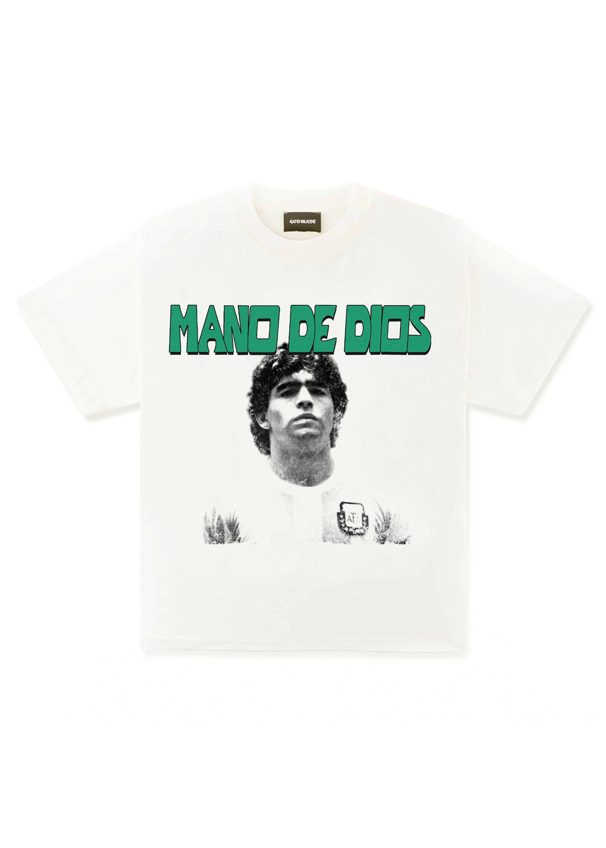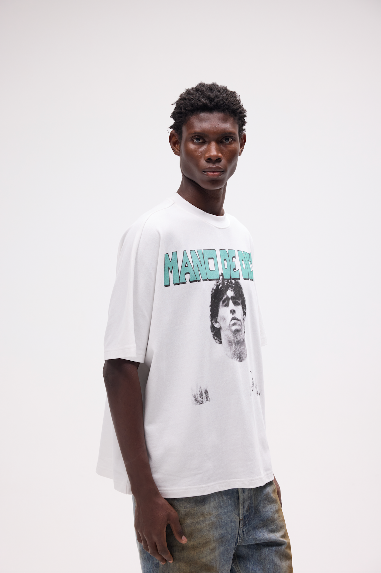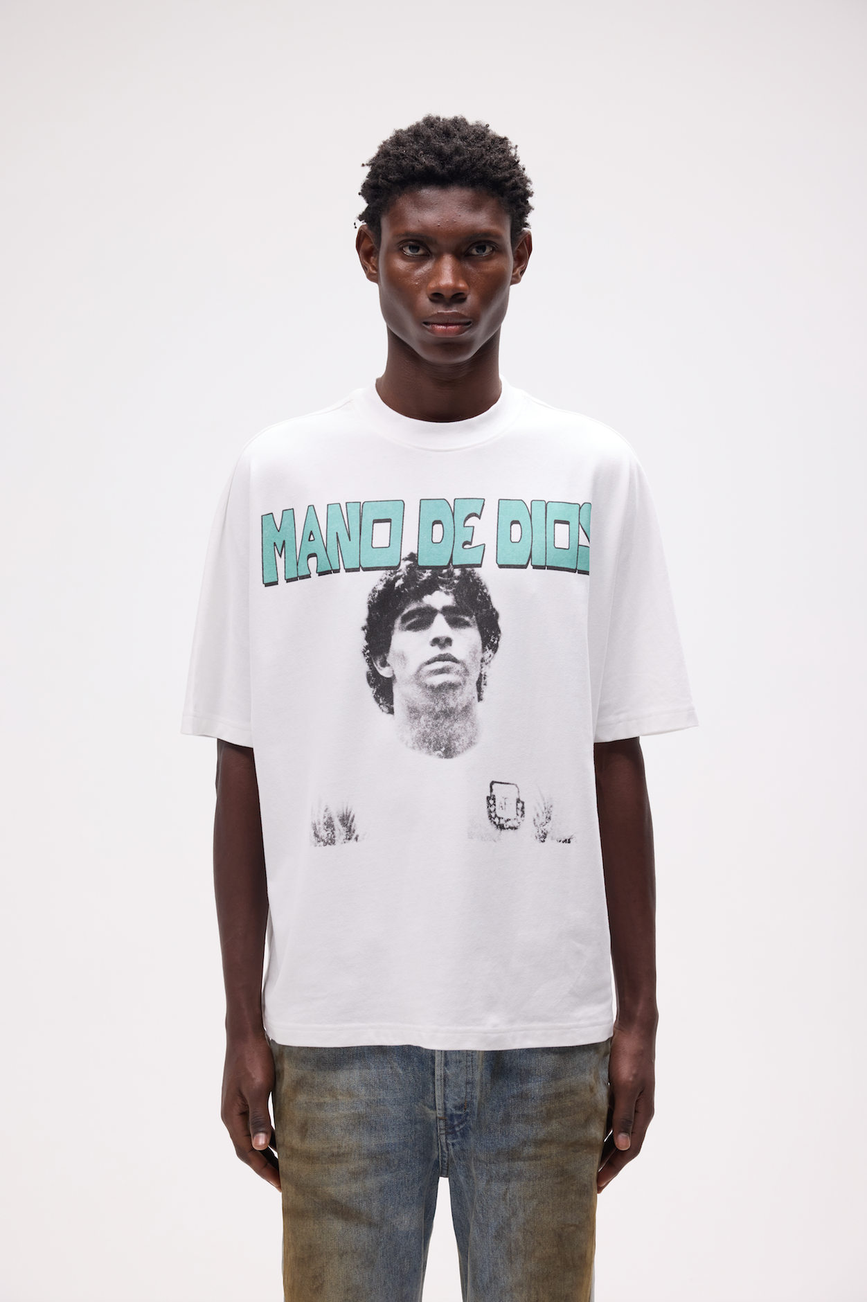 The off-white hand of god t-shirt has a slightly oversized boxy fit. featuring improved heavy weight cotton to ensure quality and longevity. Finishing this piece with Maradona and mano de dios.