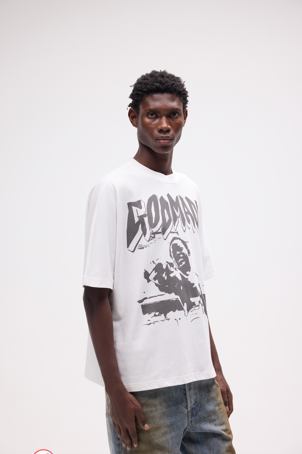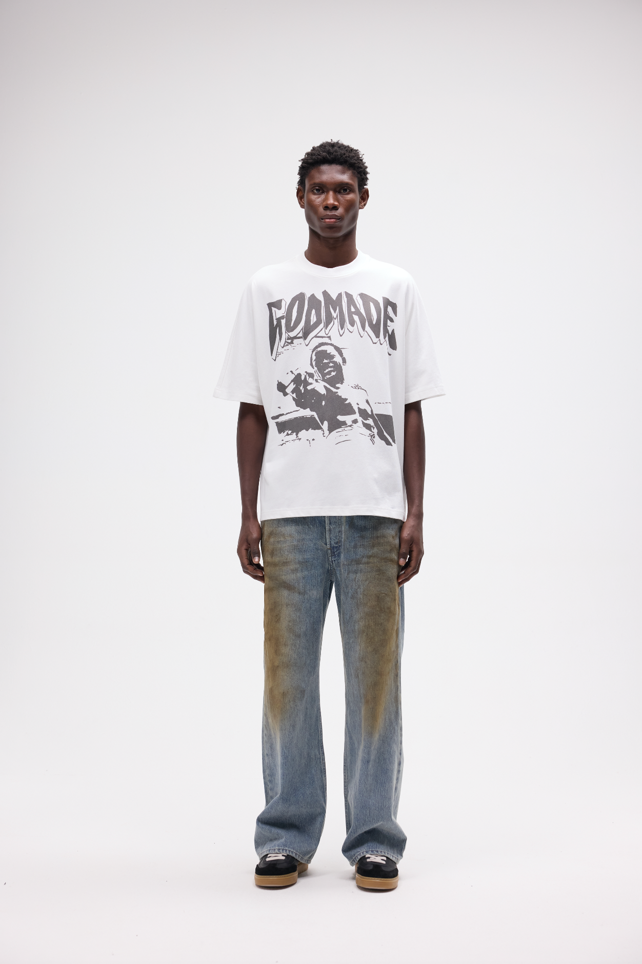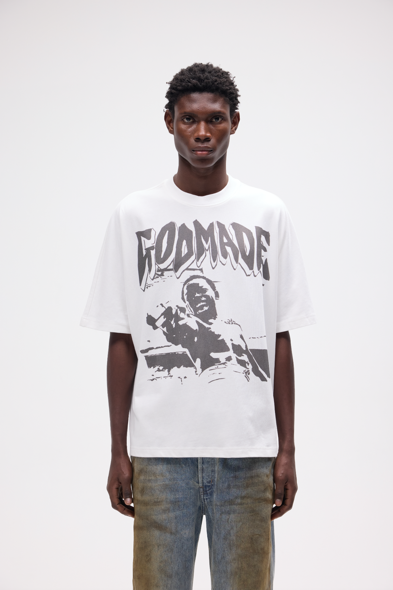 City of God, This design has been hand screen printed in a flat Off-Black colour and slightly raised. T-shirt slightly oversized boxy fit. featuring improved cotton to ensure quality and longevity.